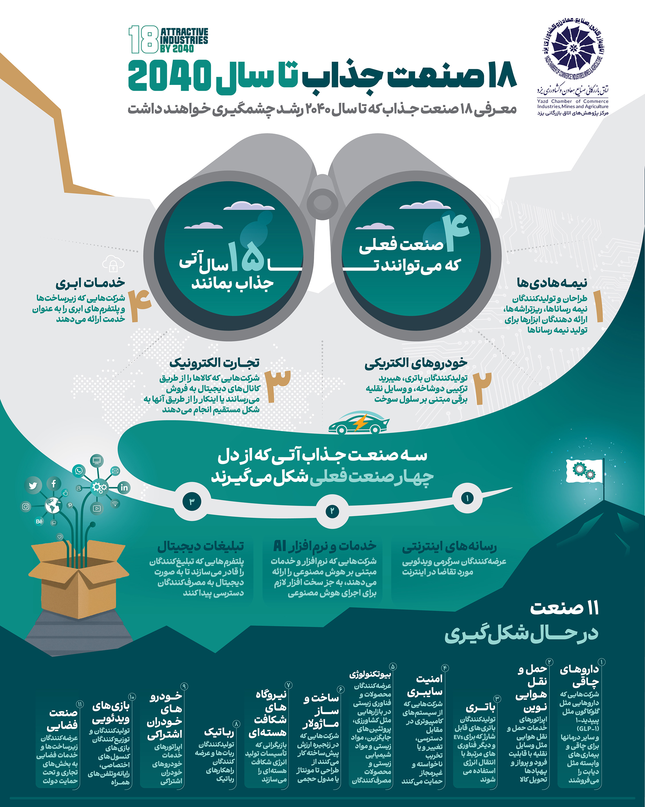 مرکز پژوهش‌های اقتصادی اتاق بازرگانی یزد در تازه‌ترین گزارش خود با عنوان «۱۸ صنعت جذاب تا سال ۲۰۴۰ »، به تحلیل بخش‌هایی از پژوهش معتبر مک‌کینزی و معرفی صنایع آینده‌داری پرداخته است که توانایی بازآفرینی اقتصاد جهانی را خواهند داشت.