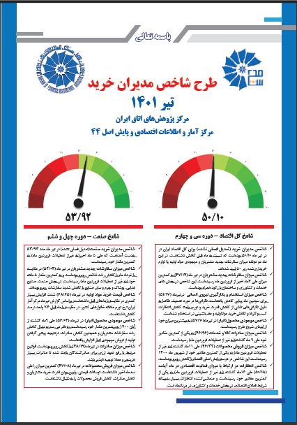 شاخص مدیران خرید (تعدیل فصلی نشده) برای کل اقتصاد ایران در در تیر ماه 50.10 بوده‌است که نسبت به ماه قبل کاهش قابل توجهی داشته‌است. در این ماه دو مؤلفه میزان سفارشات جدید مشتریان و موجودی مواد اولیه یا لوازم خریداری‌شده زیر 50 ثبت شده‌اند.